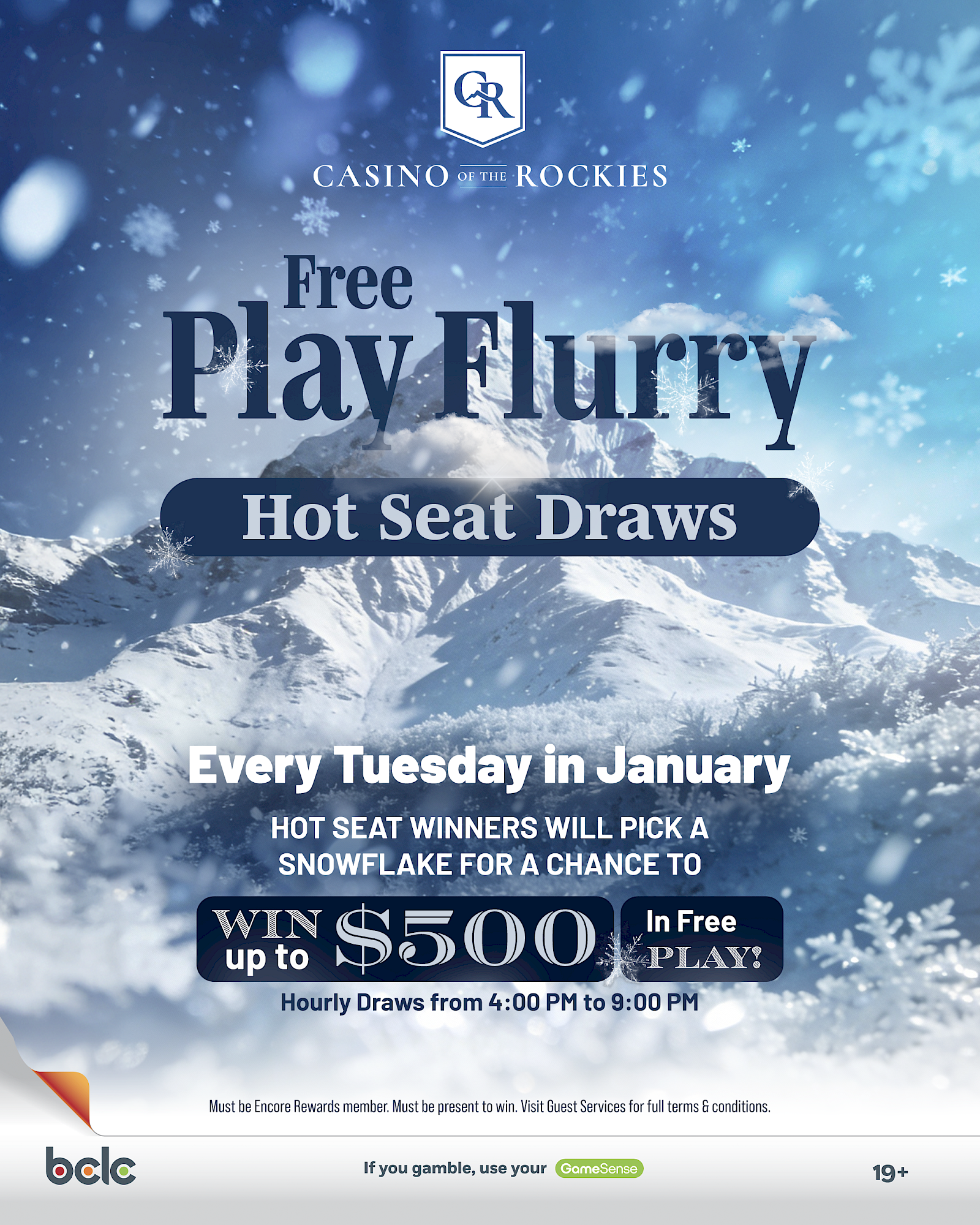 Let it snow…Free Play! Every Tuesday in January, Hot Seat Draw Winners from 4 PM to 9 PM will pick a snowflake and uncover prizes worth up to $500 in Free Play. Don’t miss your chance to cash in on the winter fun!