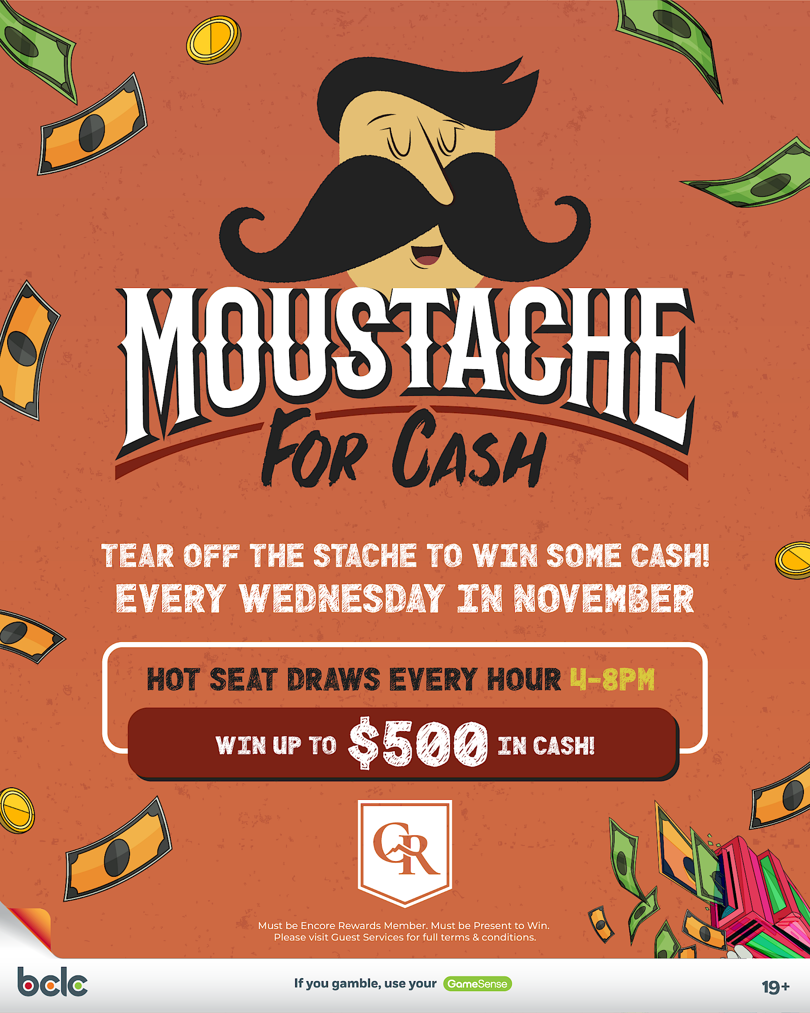 Hot Seat Draws every hour from 4 PM to 8 PM. Each hour, a lucky guest will get the chance to tear off a moustache and reveal their cash prize!