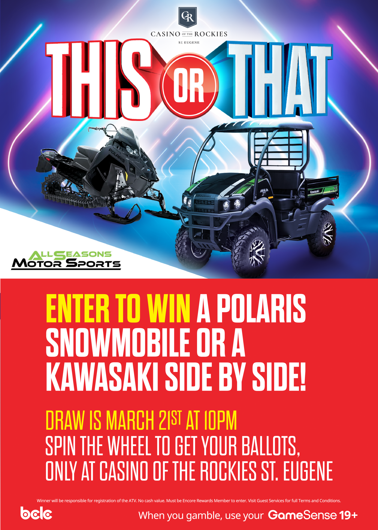 Starting Feb 8th, enter ballots daily for a chance to win one of two epic prizes, a Polaris Snowmobile or a Kawasaki Side‑by‑Side in partnership with All Seasons Motor Sports!